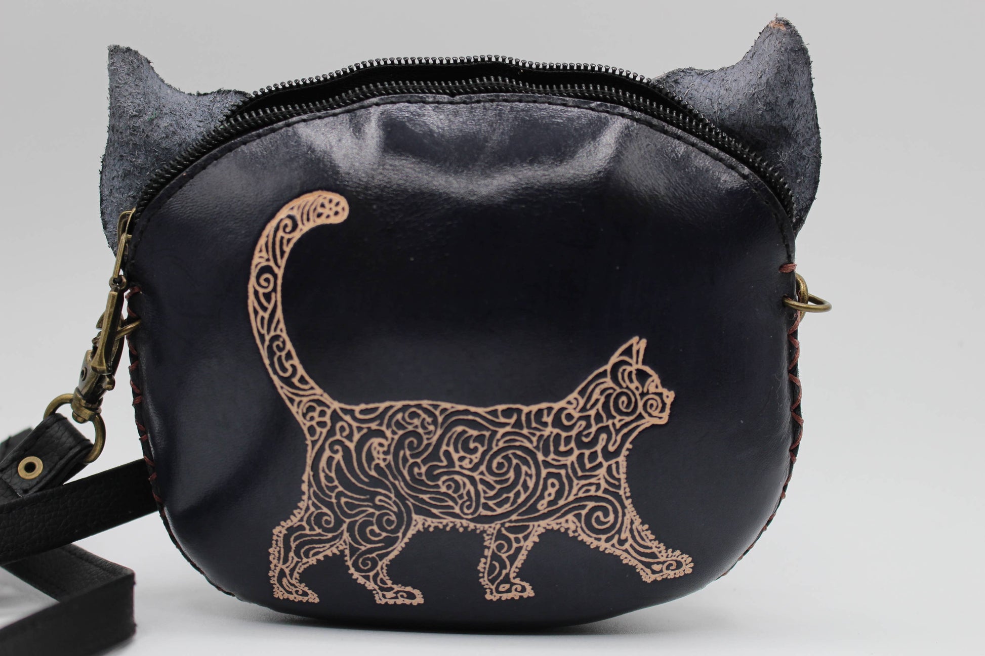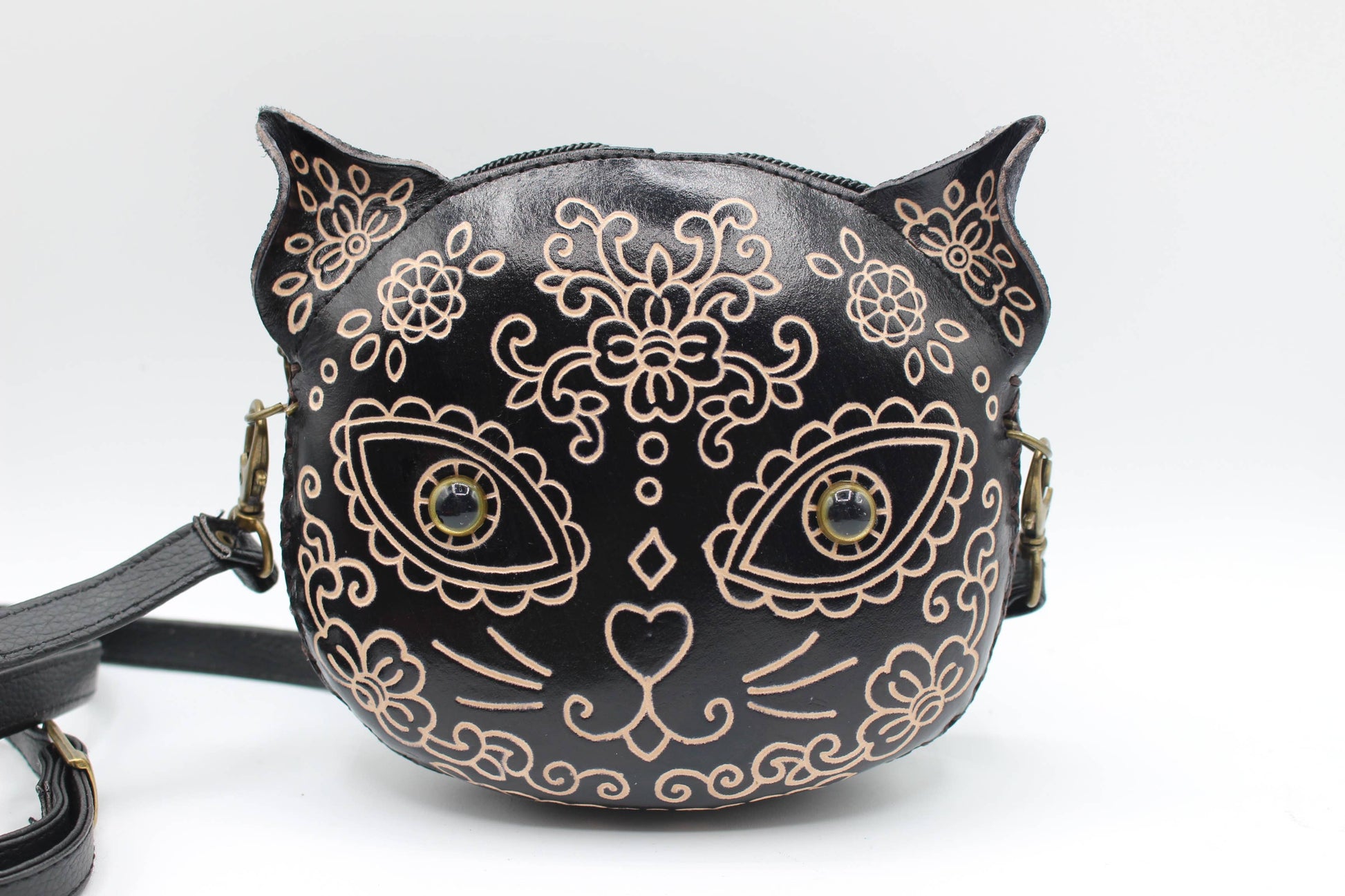 This cute little sugar skull cat crossbody purse is created from premium genuine leather. Hand dyed & hand tooled. Sturdy zipper opening on top. A removable long strap attached. This little purse is great for your keys, credit card and your necessities.