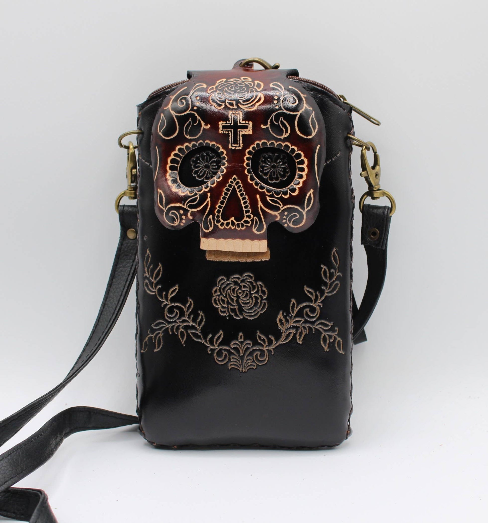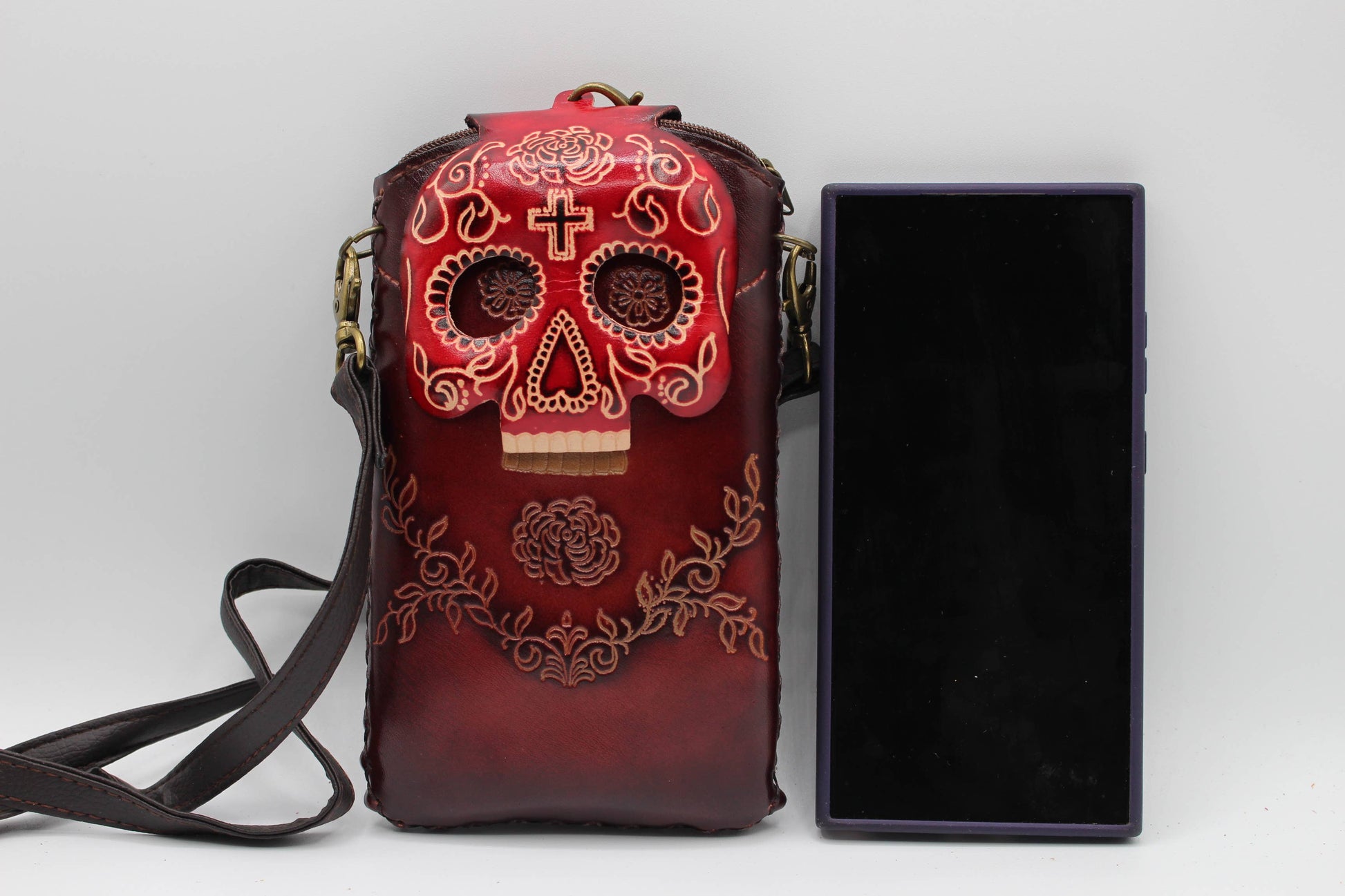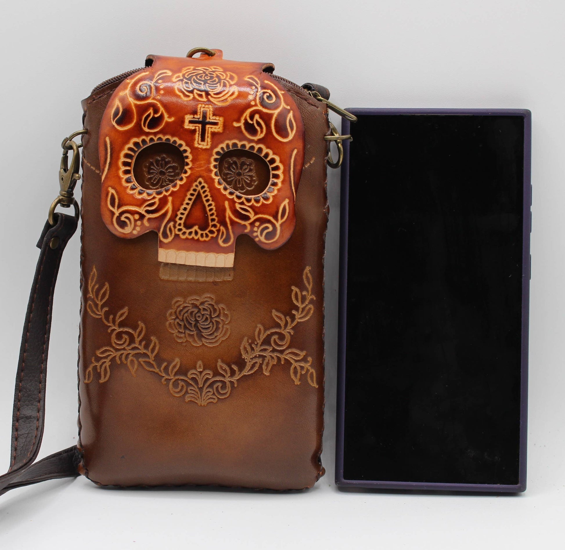 This cute day of dead cell phone case is perfect for carrying a cell phone of any size up to iPhone Max, in addition to a back pocket for IDs and credit cards. The colorful sugar skull top, made from genuine cowhide, is attached with a magnetic closure. It contains a wristlet strap as well as a removable 62" faux leather crossbody strap that gives you multiple options to carry your phone around easily. We also use a sturdy, soft faux leather that allows us to stitch a pocket to the back of the cell phone case, perfect for carrying credit cards and/or IDs.